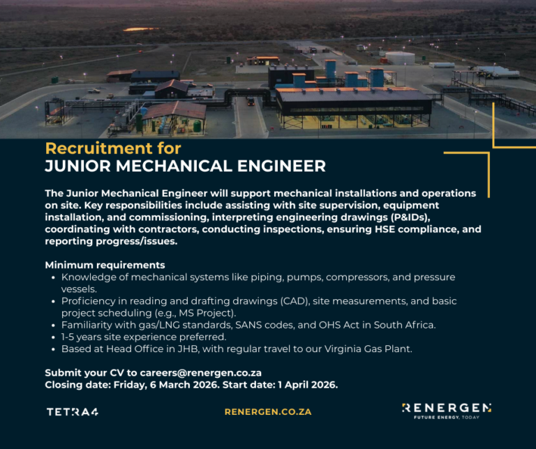 Renergen believes in diversity and equal opportunities. We welcome all applications – regardless of gender, ethnicity, religion, ideology, disabilities, age or sexual identity. Preference will be given to applicants from designated groups and people with disabilities according to our Employment Equity Plan. This includes reasonable accommodation to enable individuals with disabilities to perform essential job functions.